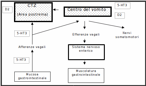 La metoclopramide è un'antagonista competitivo dei recettori D1 e D2 (dopamina) e dei recettori 5-HT3 (serotonina), nonché agonista aspecifico dei recettori 5-HT4 coinvolti nella stimolazione dei neuroni colinergici enterici. L'affinità sui recettori D2 è responsabile anche dei sintomi extrapiramidali10,12. Le principali indicazioni sono i disordini motori della prima parte del tratto gastro-intestinale che includono dispepsia funzionale, ritardato svuotamento gastrico, nausea e vomito di natura infettiva, post-operatoria o post-chemioradioterapia9,10.